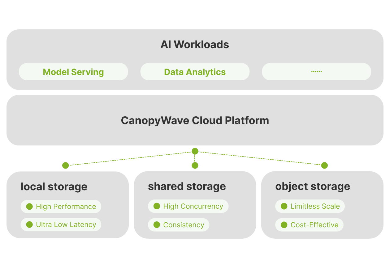 Our flexible storage infrastructure is designed to support diverse AI workloads. Choose between local storage, shared storage, or object storage based on your performance, scalability, and data access requirements. Canopy Wave ensures your storage solution aligns perfectly with your workflow.